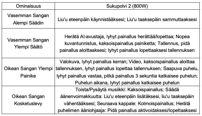 Vastaan puheluun: Paina oikeassa temppelissä olevaa painiketta ottaaksesi puhelun vastaan. Pitkä painallus 2 sekuntia lopettaa puhelun.